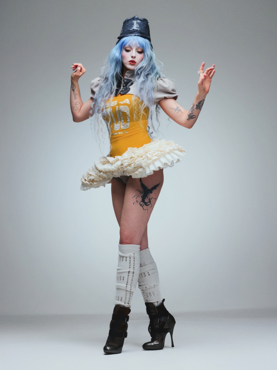 Bodysuit and leggings FABIAN KIS-JUHASZ, fascinator MIRJAM NUVER, shoes FOR THE SOUP ARCHIVE, rings DINOSAUR DESIGNS