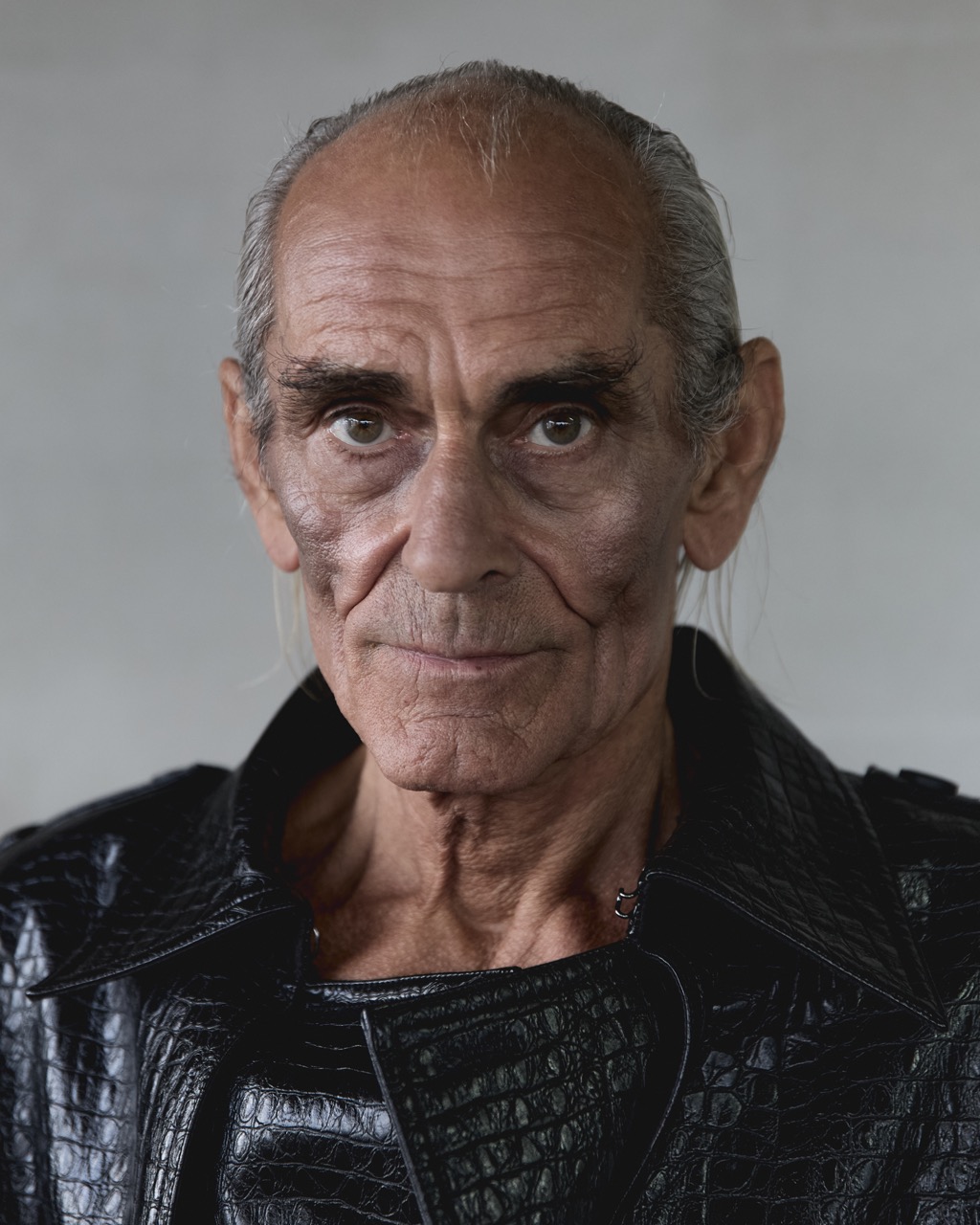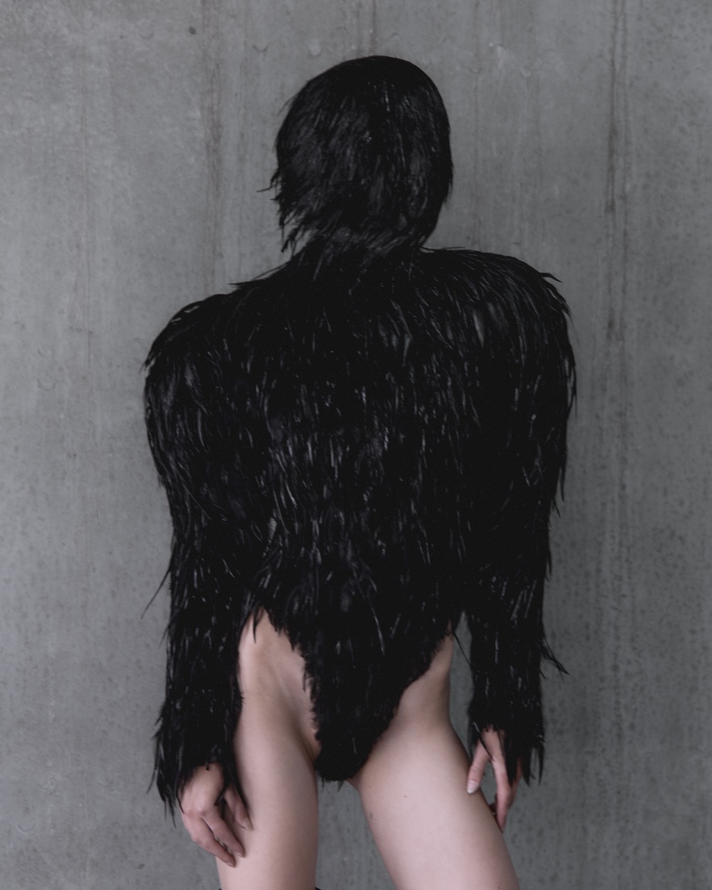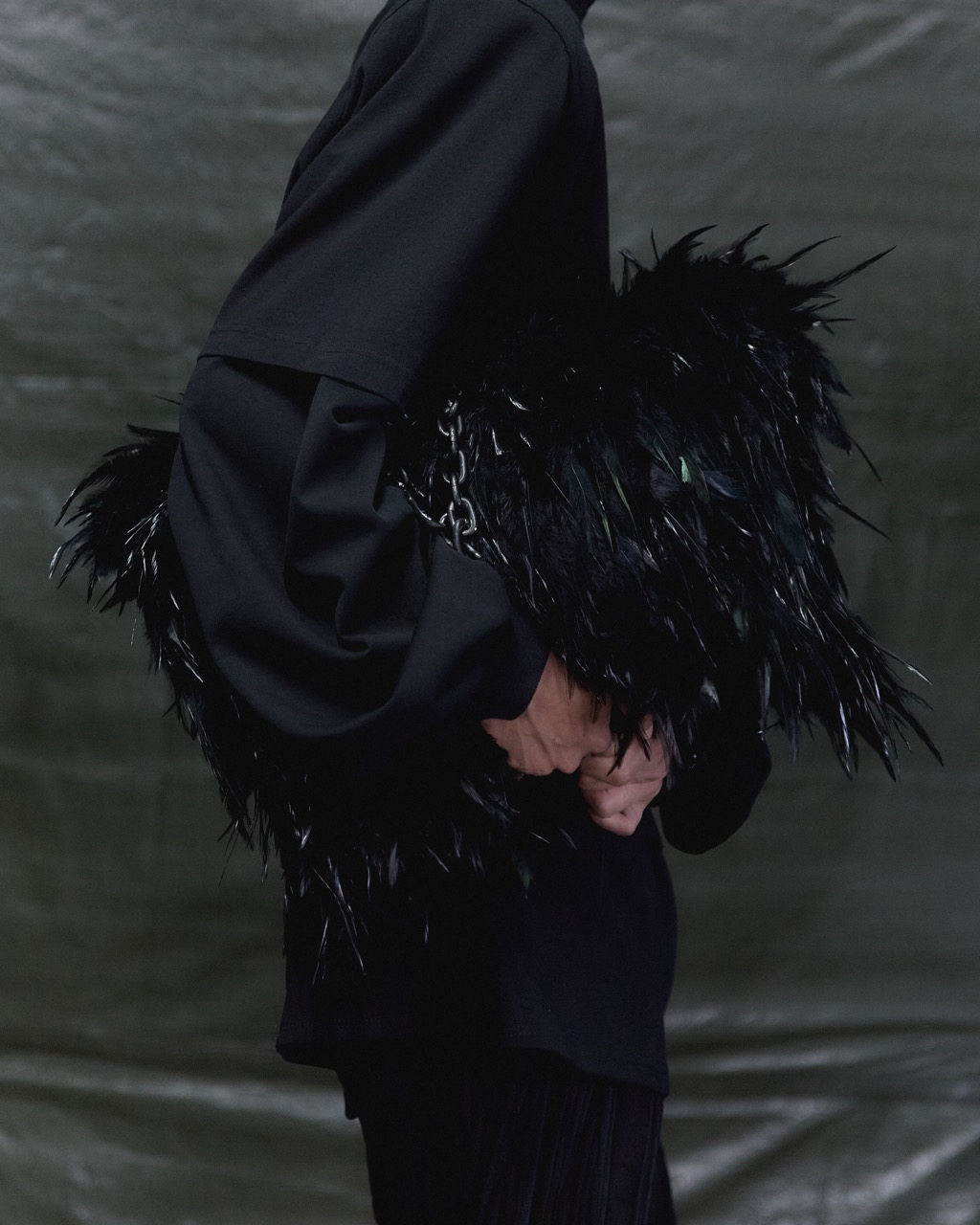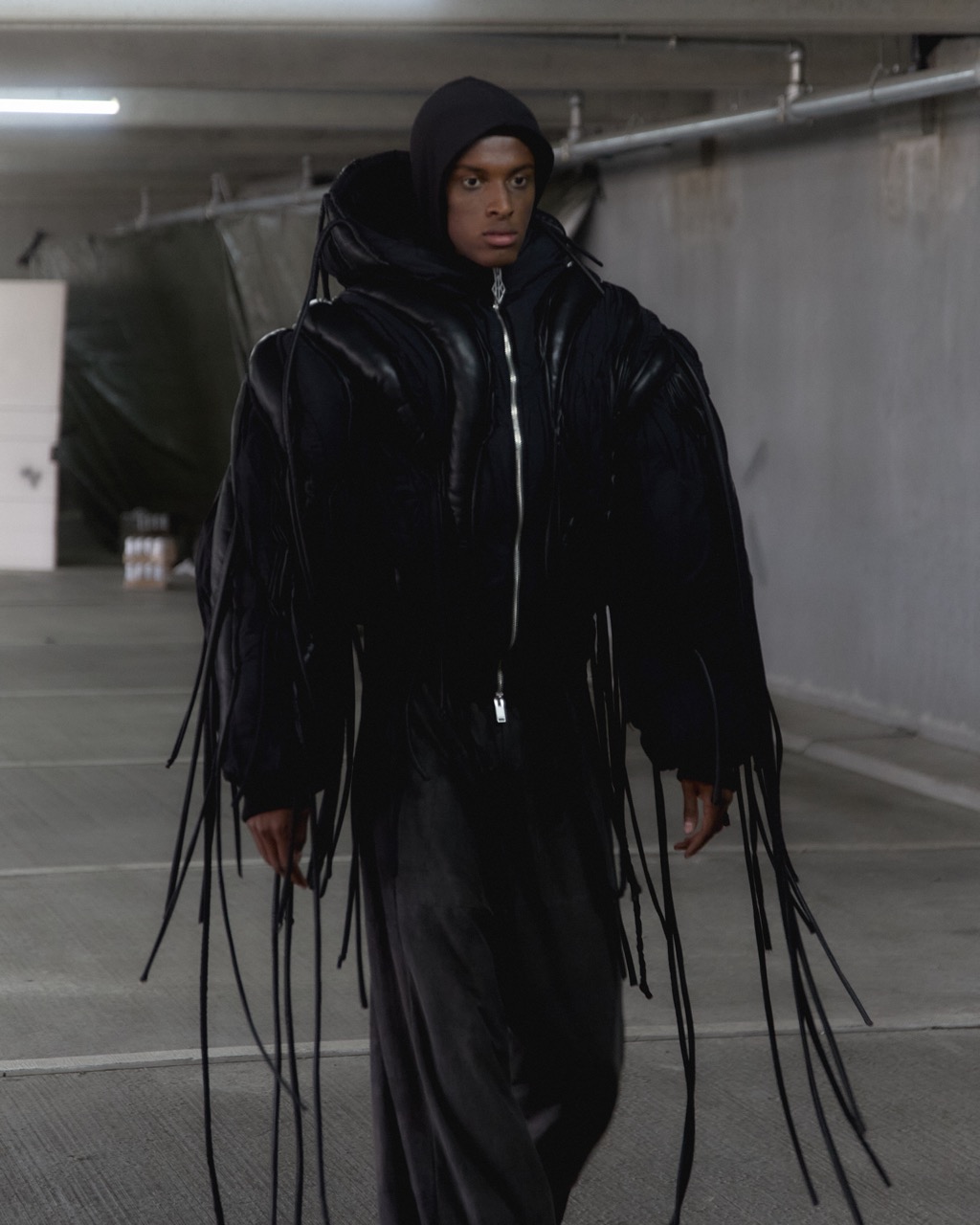 The styling threads a line between street and ceremony, where bodybuilder bravado clashes with fragility. The collection features banal “Doner House” branding on simple oversized tees, paired with excessive draping and intricate construction – padding twirls up the legs like baroque twines. A matte black football jersey pairs with sculptural gloves. The standout look feels like a raven, face and torso fully covered in synthetic feathers. Padded bombers feel like suburban armor. The only thing missing? A dramatic return of the full bush, because why stop at bark boots when you can go full forest?