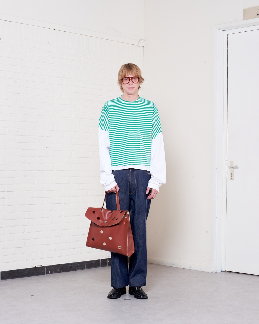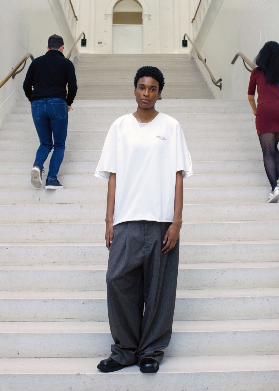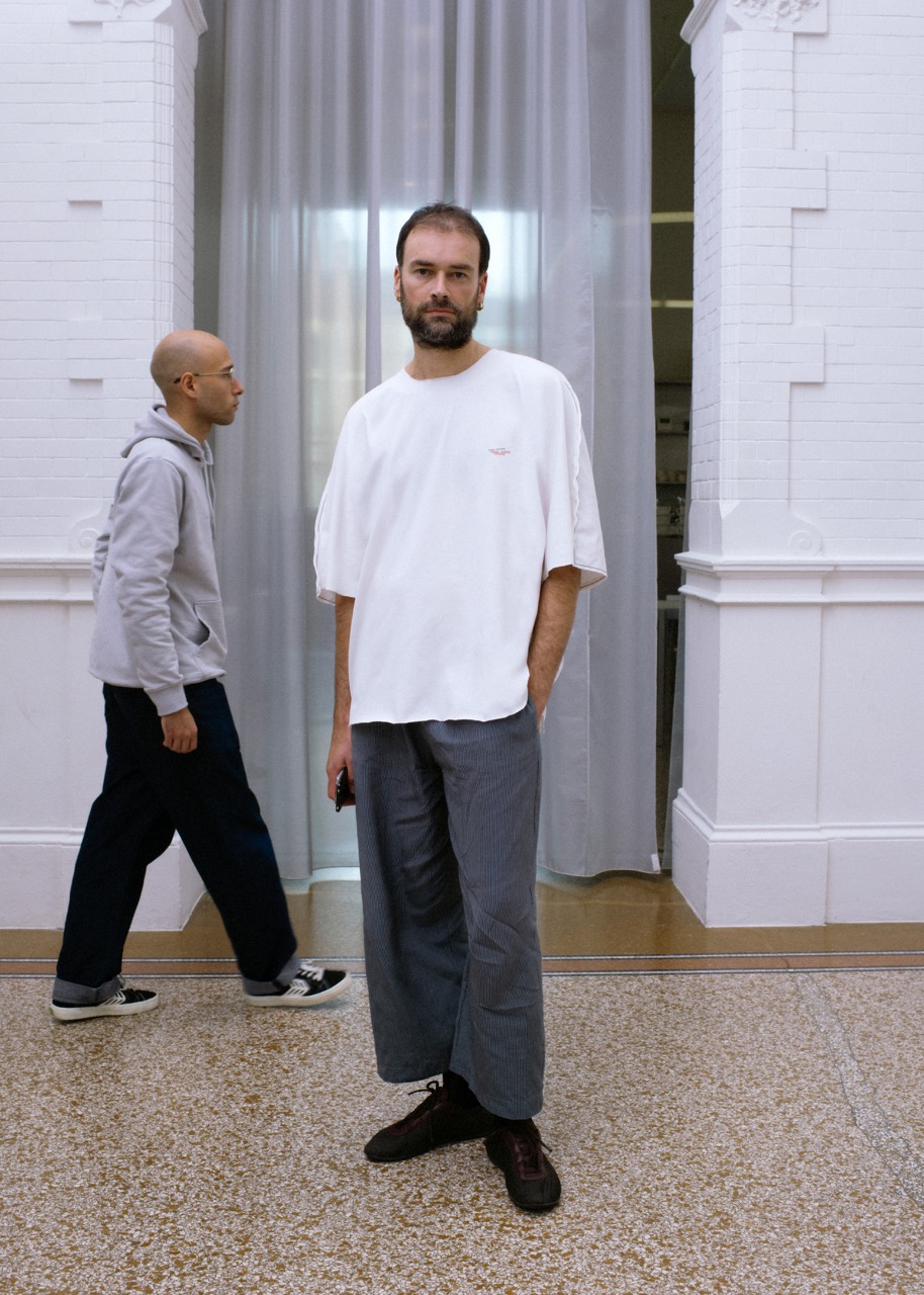 I believe Dutch culture is quite straightforward, maybe a little humorous. Someone once compared us to the “Droog” interior design movement, where it’s quite constructionist, a bit rough, and witty. It seems like that fits quite well. I don’t know if that comes from Dutch culture, but I do personally relate to that. In terms of the comparison to French culture, maybe there’s a contradiction to French fashion culture. Yes, we do go to Paris, but it’s a place where we meet up with people from around the world. The Amsterdam bubble is very much removed from the global fashion bubble, which does give us a certain narrative outside of the classical French fashion culture. Showing out in the streets or in an apartment, making the imperfect garments, unfinished garments, working with friends as models… all feel quite surprising within the Parisian landscape and industry. I always like to see if we can authentically do things, and I do believe maybe our heritage leads us to do things in a different way than how it is usually done. We try to make it feel genuine, where I can imagine if you’re in the Paris bubble, you could get sucked in with what is expected for a brand and what the industry is doing. So I feel we can still authentically do things without being influenced too much. This might relate to being based in Amsterdam, or maybe even to being Dutch: no nonsense, straightforward, blunt even.