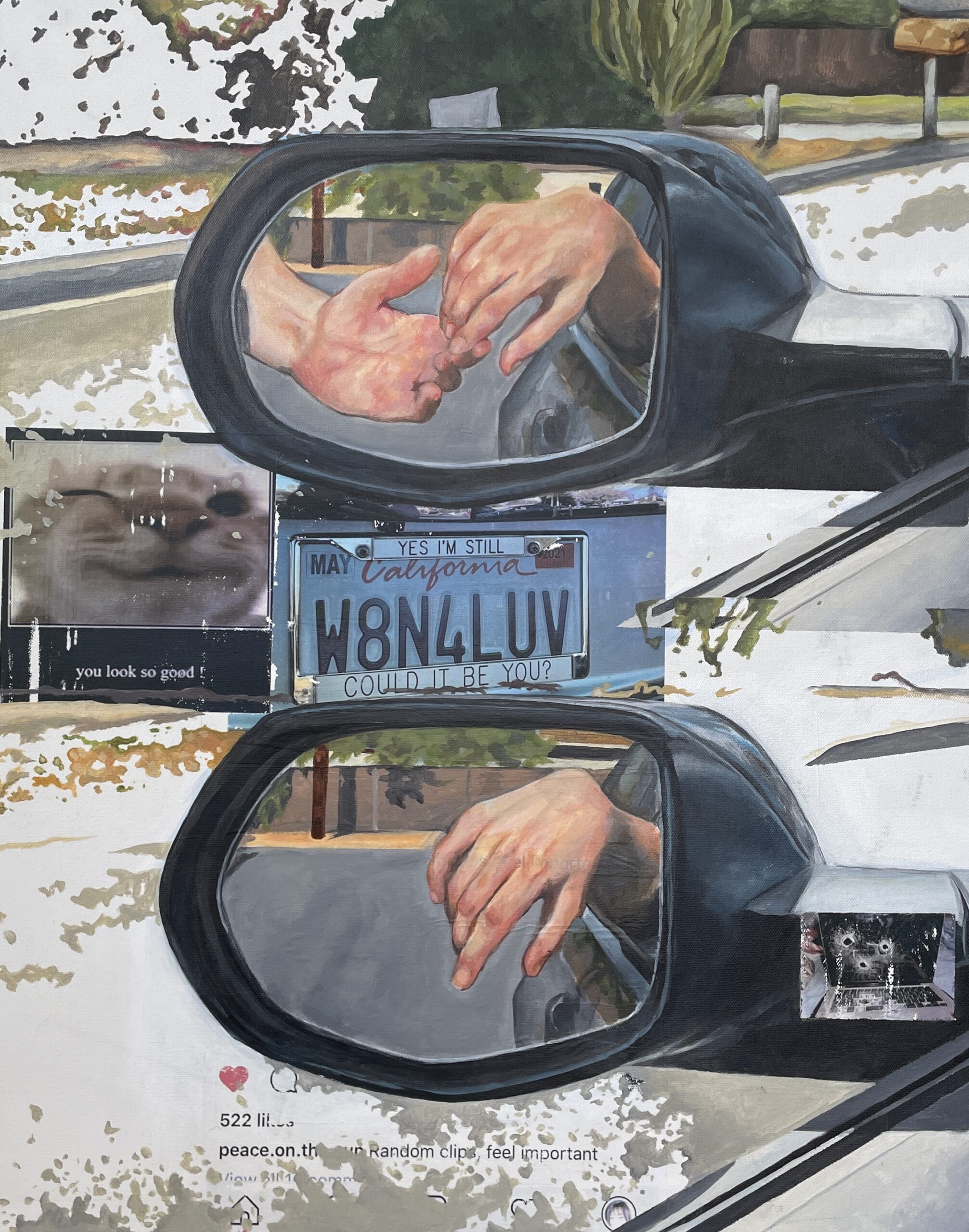 I’ve been trying to collect more from my immediate surroundings for recent work. Like taking pictures while driving or going on a walk. Or even screenshotting a funny Hinge message. Traveling is new for me. And being online is like traveling. I like the idea of looking for signs, the irony or faith in objects. Memories attached to something so simple like pan-fried eggs. Feeling lucky in spotting a four-leaf clover vinyl decal adhered to an old truck. I’ll squeeze the symbolism out of anything to make a moment feel more special. I have a folder in my camera roll titled “Pumpkin” where I add new images daily. I look to anything that feels sentimental, makes me laugh, makes me feel heavy. Sometimes I’ll pick an image just because. I’ll discover what these mean later. I try not to overthink this part. If I feel drawn by an image, whether emotionally or aesthetically, it will find its way into the work. The image will inevitably transform, as it will be imperfectly painted or reprinted, tiled, off-colour, out of context, reborn.