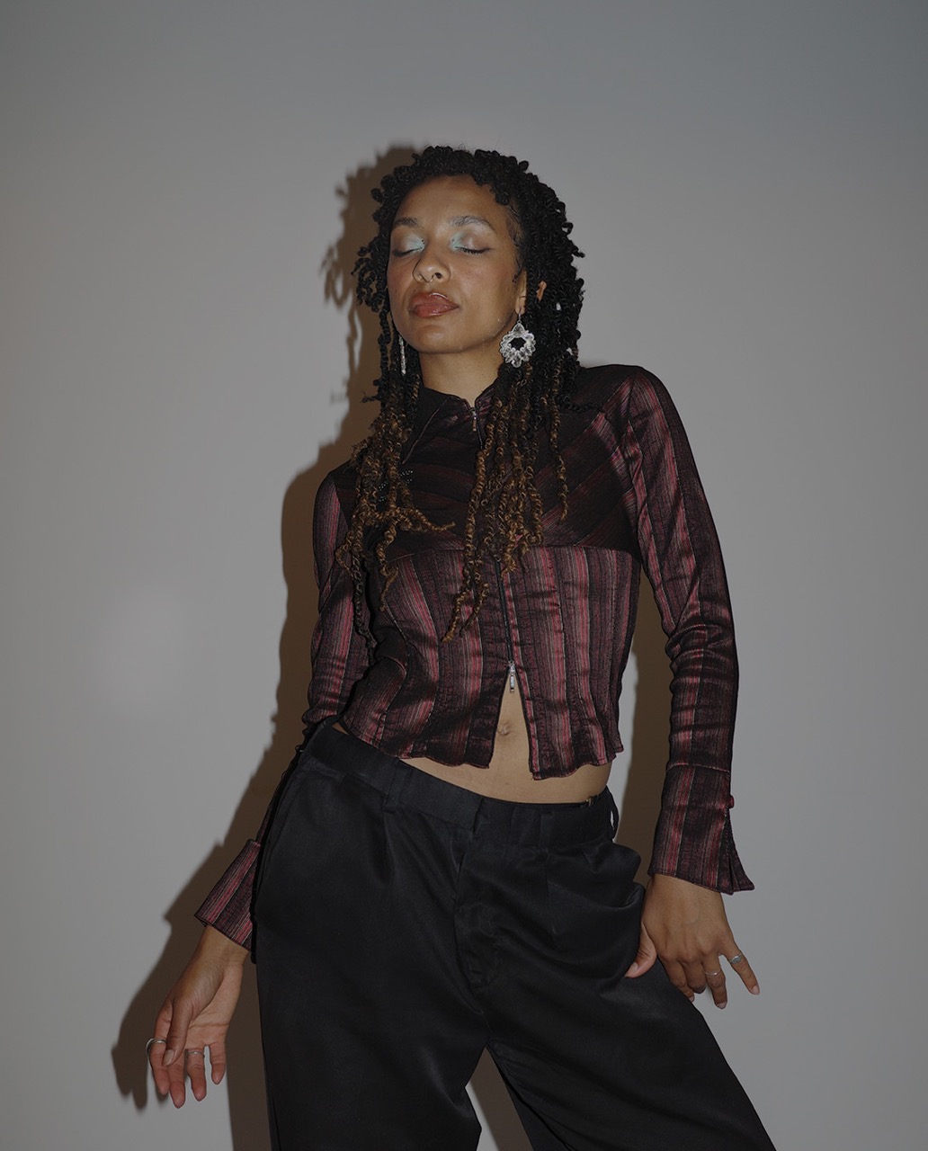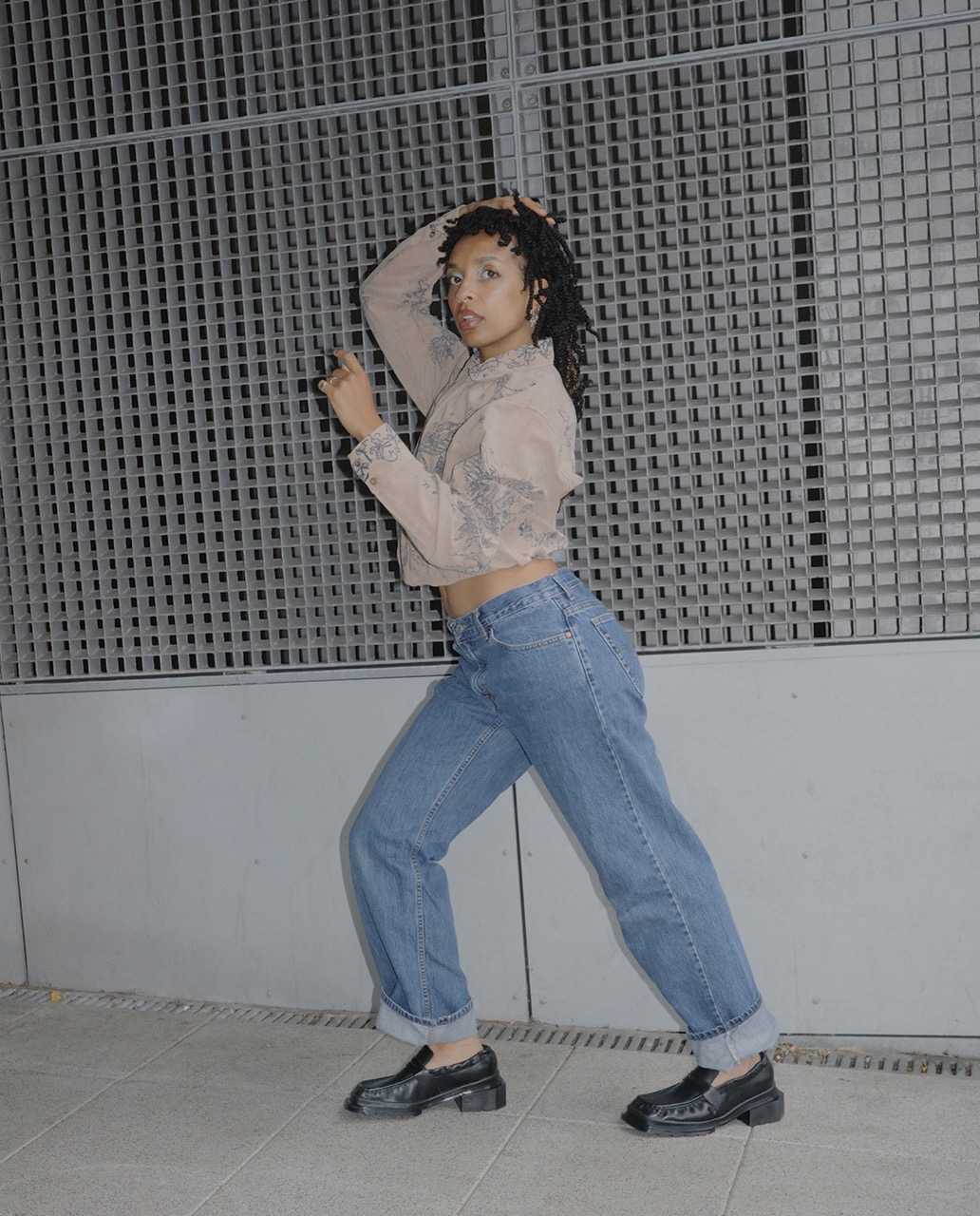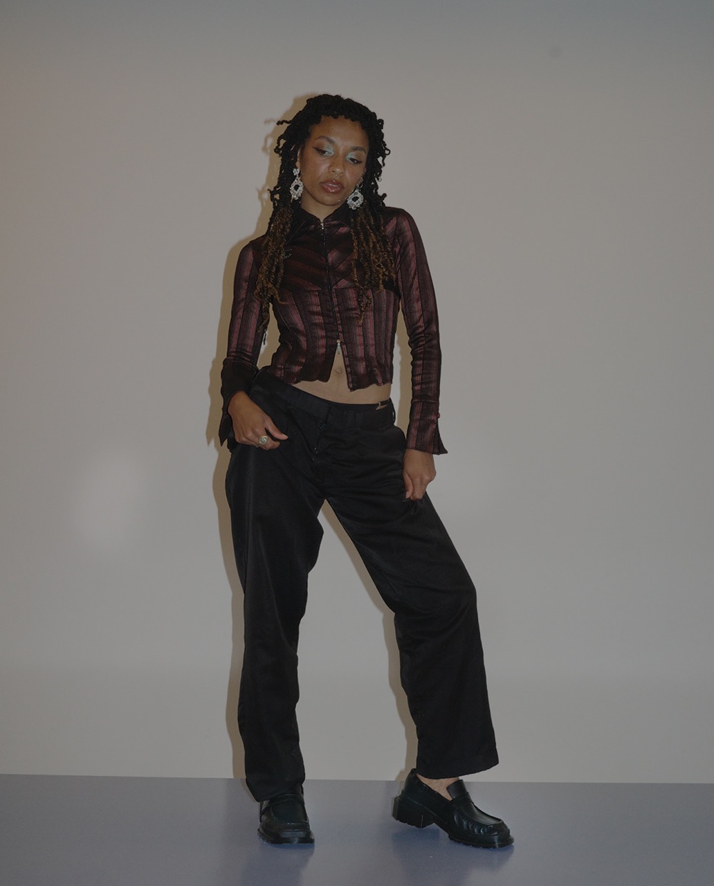 We caught up at her performance of “POP POP POP” by Idles, a post-punk reimagining that’s a cover only in name. Magi tears it apart, flips it inside out, and makes it pulse with her own infectious energy. Offstage, she’s sharp, warm, magnetic; onstage, she’s pure electricity. Her style is mischievous preppy – deconstructed plaid and a pierced tank – with the Maybole Loafer underfoot to ground it all (no gatekeeping here, you can get your pair from Friday on at Glamcult Store).