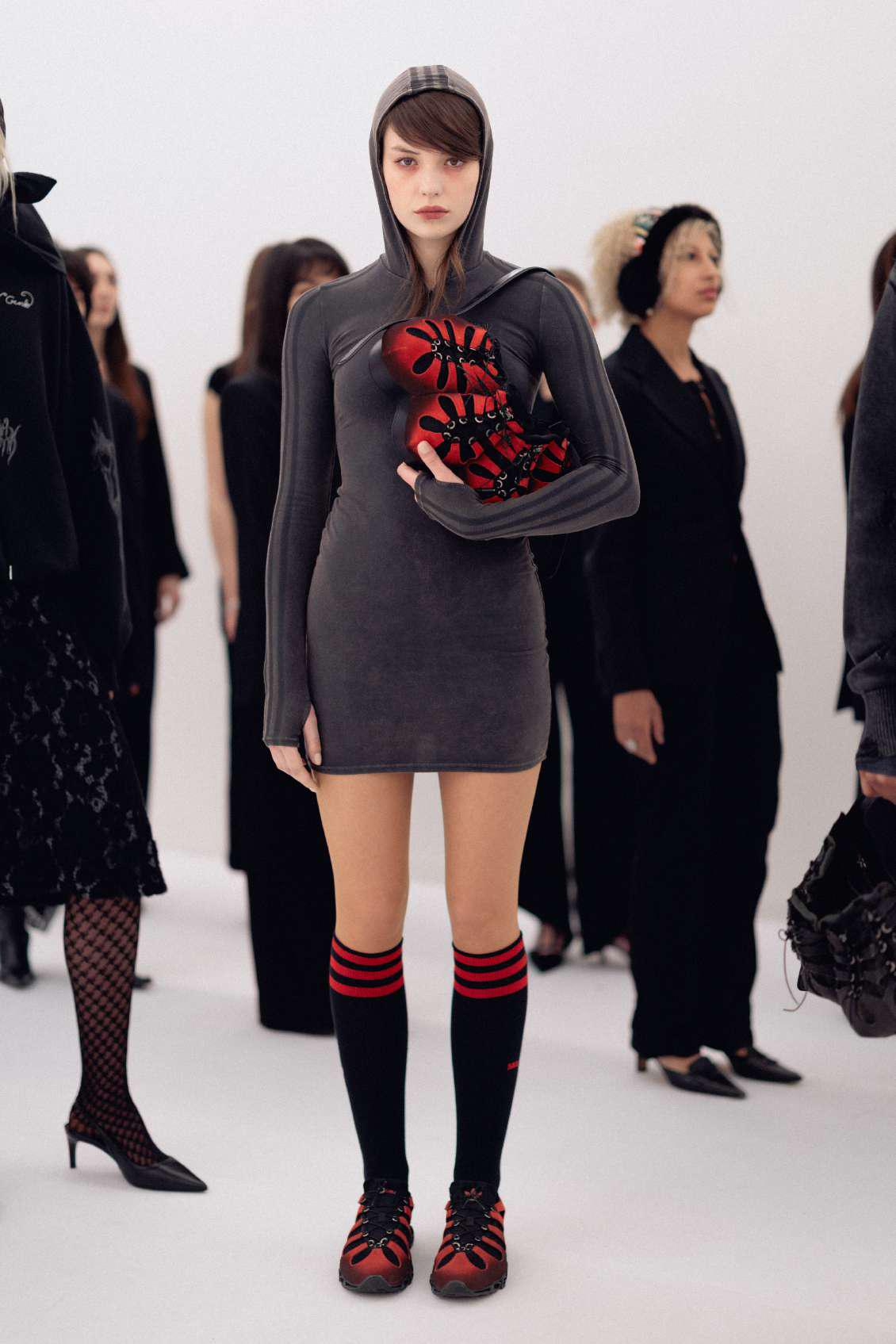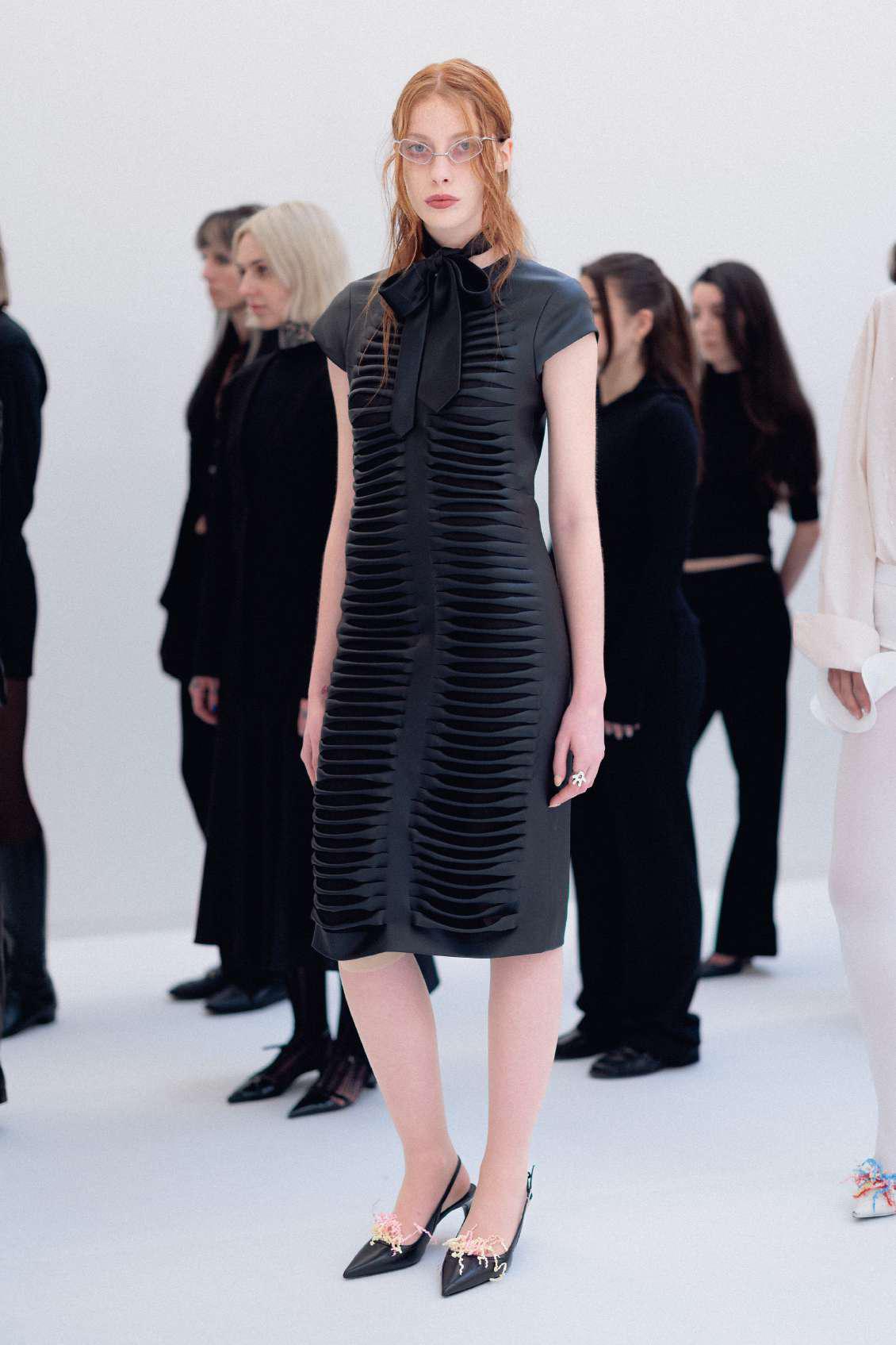 The cold sterility of masculine-associated machinery (think office equipment and its aggressively messy paper shredders, or intrusive medical scanners that reveal you to the core) is now reappropriated by women dressing for other women, where clothing doesn’t seek male approval. Featuring skeleton shirts, ribbed-like dresses, the garments literally expose the chalky insides. X-ray vision now rubs shoulders with the paper shredder machine, where one shows everything and the other destroys evidence. The story takes us to work where the 9-to-5 tie turns bow-like or it disintegrates into a polo shirt. The feminine blends into the masculine, where work bottoms aren’t just trousers, they’re also a pencil AND a maxi skirt (yes, all three at once, and no, male designers still can’t give us enough pockets). Shreds stick to heels, and tissues are scrunched up and stuffed in granny bras. This collection also birthed the fourth love-child between Avavav and Adidas, and this time it’s brought to the office to play. Sneakers turned bags are firmly held by some, and the three-stripes eternally meet the four toes.