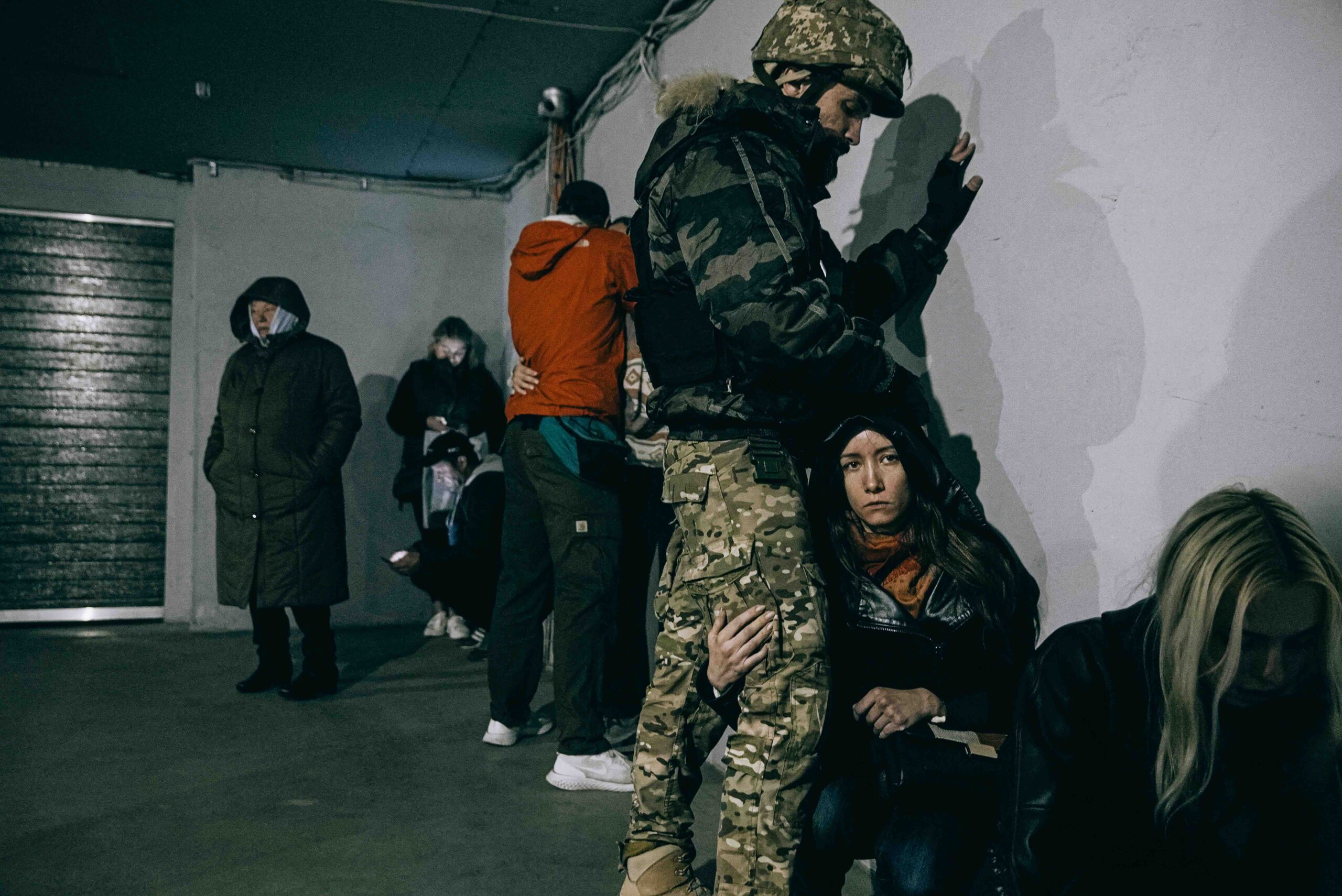 A soldier protects a woman in an underground parking lot near the drone strike in Kyiv 2022 – Julia Kochetova