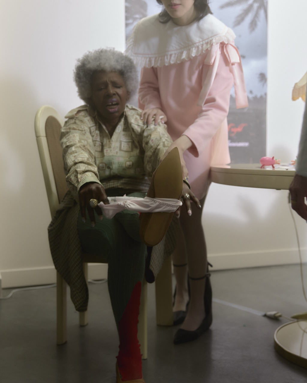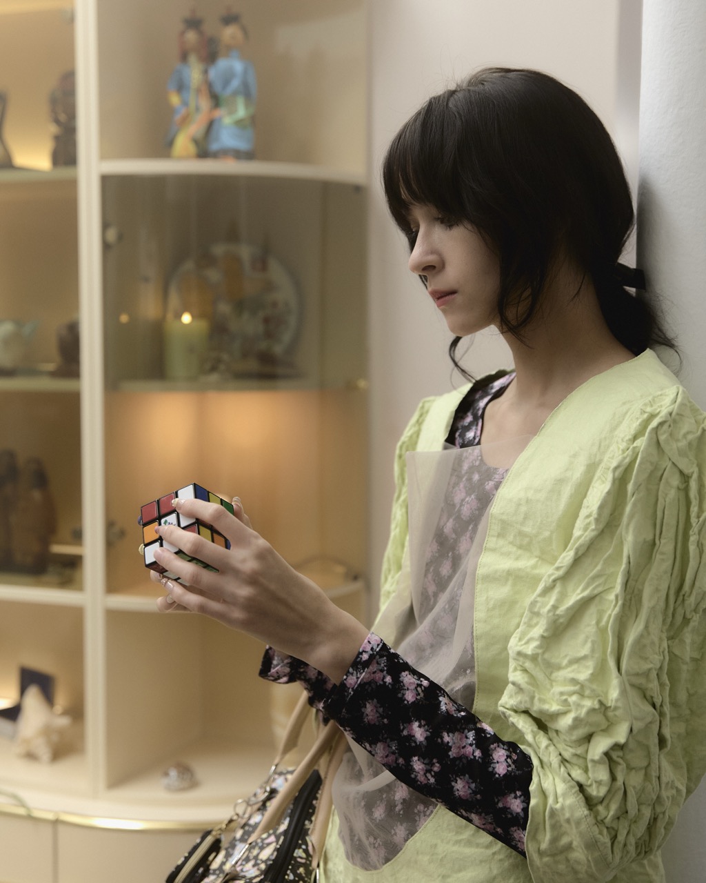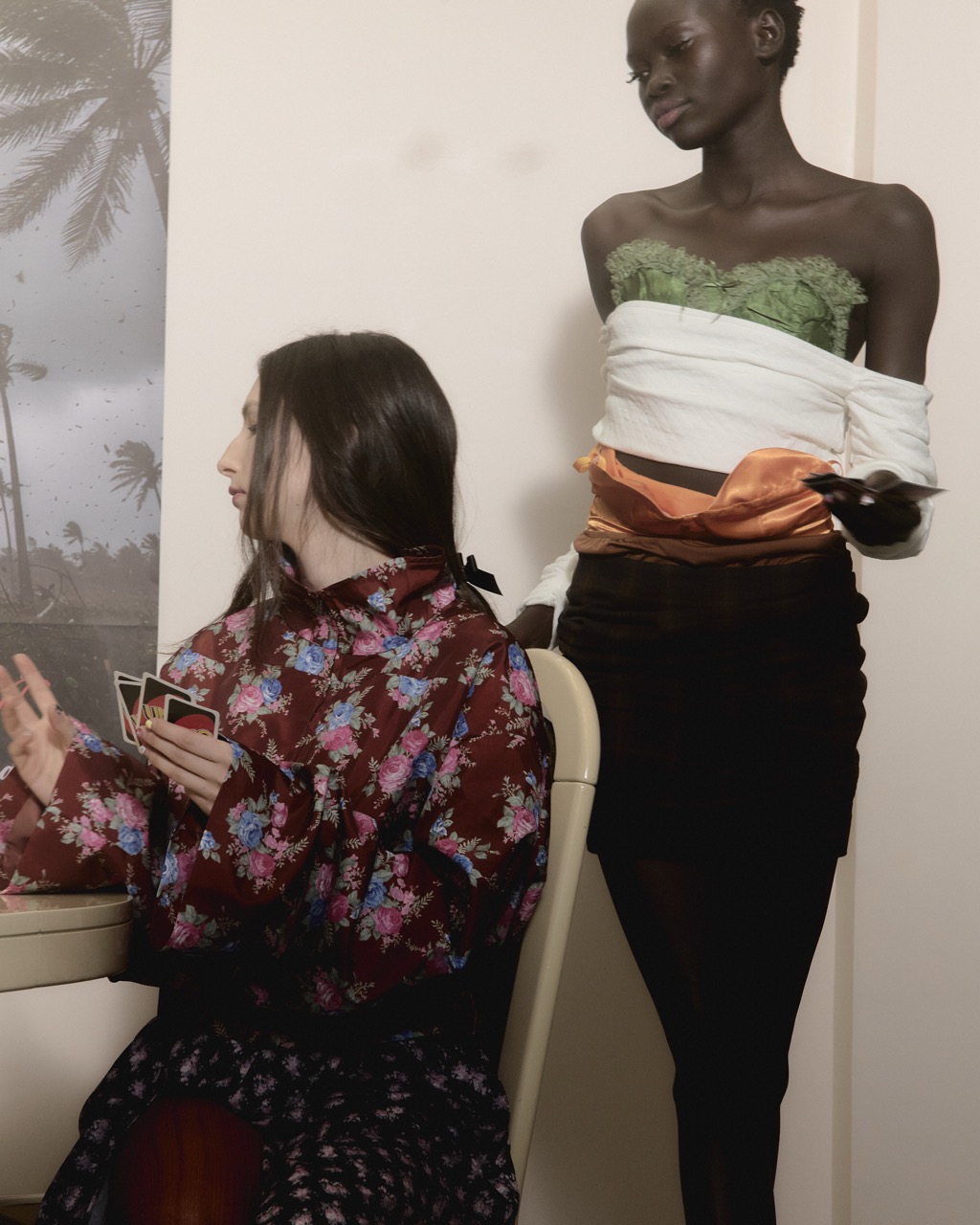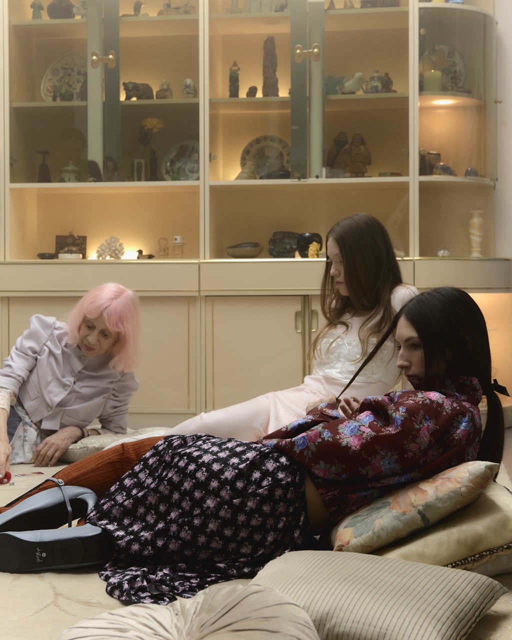 Once again, Fax stages her traditional cast of soft yet eccentric female protagonists (thankfully, no men allowed at the table). And no generations are left aside, from lightly quilted cream-like baby rompers to grandma’s adored floral pattern on a shirt, they all make a special guest appearance. Long-sleeved shirts are half-put on, skirts scrunch up as if you’ve been sitting at the dinner table for hours on end, followed by the gathering finally moving to the living room for some heated game time (garments still unstraightened).