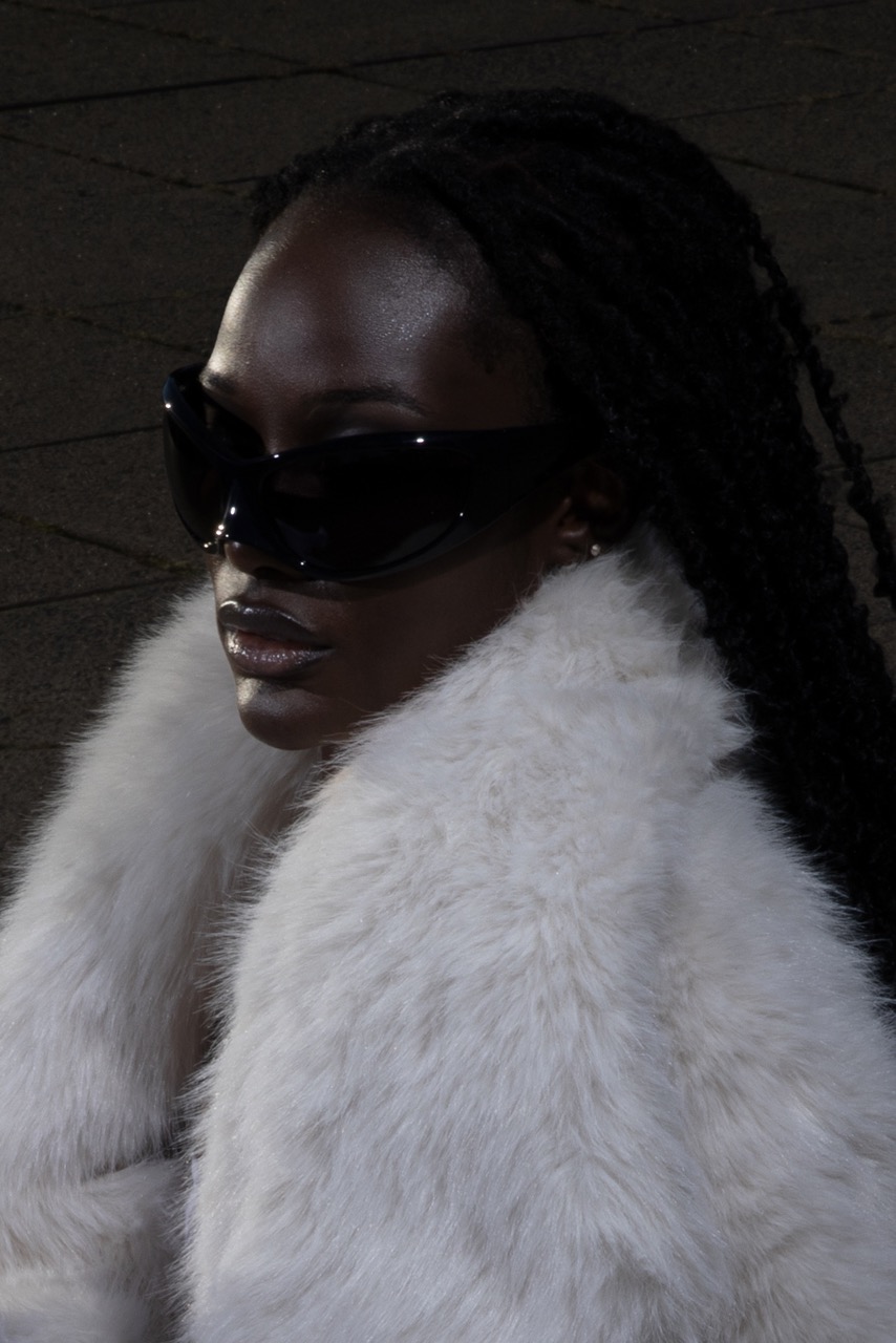 Jacket STYLIST’S OWN, tights FALKE, sunglasses BALENCIAGA